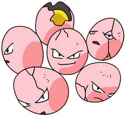 Description: Often mistaken for eggs. When disturbed, they quickly gather and attack in swarms. This POKéMON consists of six eggs that form a closely knit cluster. The six eggs attract each other and spin around. When cracks increasingly appear on the eggs, exeggcute is close to evolution.