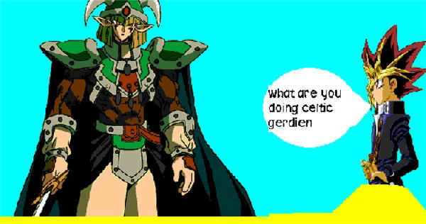 Celtic guardian makes Yami Yugi into a sand castle. |