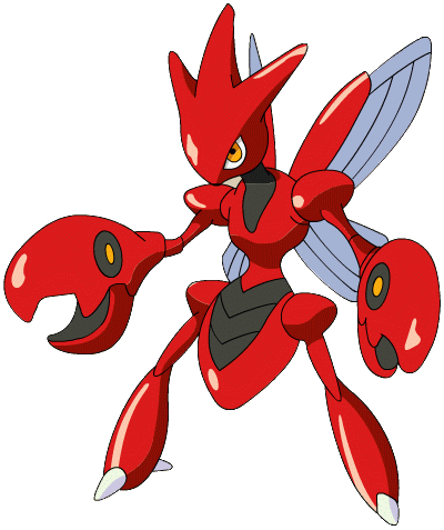 Description: Scizor has a body with the hardness of steel. It is not easily fazed by ordinary sorts of attacks. This pokemon flaps its wings to regulate its body temperature (not for flying). It swings its eye-patterned pincers up to scare its foes. This makes it look like it has three heads.