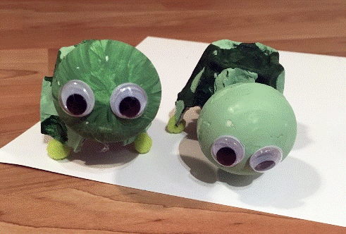 Next, paint the small Styrofoam ball one shade of green and glue googly eyes to it.