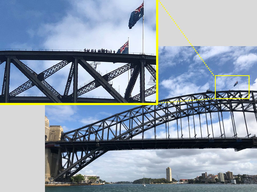 We opted not to climb the harbour bridge. Ron pointed out that at over $320 per person there were more reasonably priced ways to enjoy Sydney. We took his suggestion to go up the Sydney Eye a tower with great views, an open air observation deck and a restaurant (a tenth of the cost of the bridge). Having said that, we really did enjoy watching people brave enough to tie themselves together and scale the bridge’s arches, so if that’s your idea of a fun way to spend your money, more power to you! You’re fun to take photos of from one of the many cafes along the harbour.