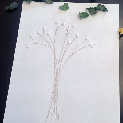 Once your child is satisfied with their arrangement, help them carefully glue the leaves and flowers onto the paper. Use a thin layer of white glue or a glue stick to prevent the paper from becoming too wet or wrinkled. Tweezers can be helpful for placing small or delicate pieces.